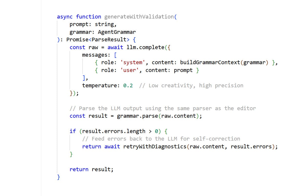 The key insight: the language server becomes the AI's type checker. If the model hallucinates an invalid structure, the parser catches it and feeds the specific errors back for self-correction. No regex hacks. No "close enough." Either the output conforms to the grammar, or the agent tries again with precise diagnostic feedback.