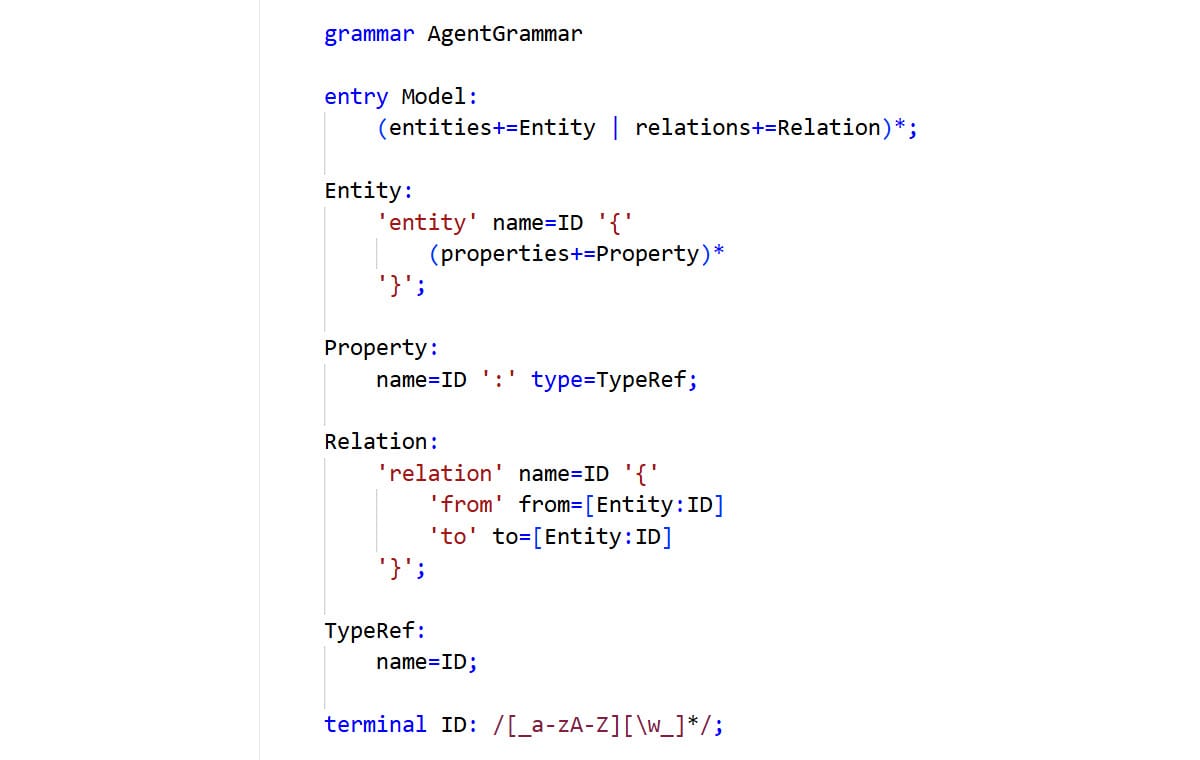A simplified Langium grammar rule - defines what 'valid output' looks like.