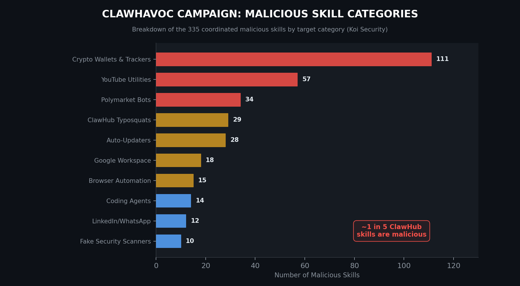The categories targeted were chosen with surgical precision: cryptocurrency tools (111 skills), YouTube utilities (57 skills), Polymarket bots (34 skills), ClawHub typosquats (29 skills), and — in a particularly dark bit of irony — auto-updaters (28 skills). [¹⁵] Updated scans have even identified fake security-scanning skills among the malicious entries. [¹⁶]