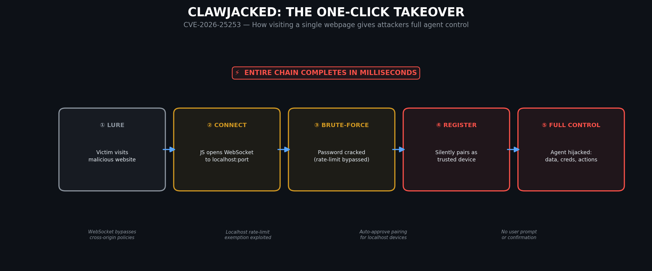 Running in parallel with the supply chain campaign was the disclosure of CVE-2026-25253 (CVSS 8.8), a vulnerability that researchers described as completing in "milliseconds." [¹⁸] The flaw exploited a design weakness in OpenClaw's Control UI: it accepted a gatewayUrl query parameter from the URL without validation and automatically initiated a WebSocket connection to the specified address, transmitting the user's authentication token as part of the handshake. [¹⁹]