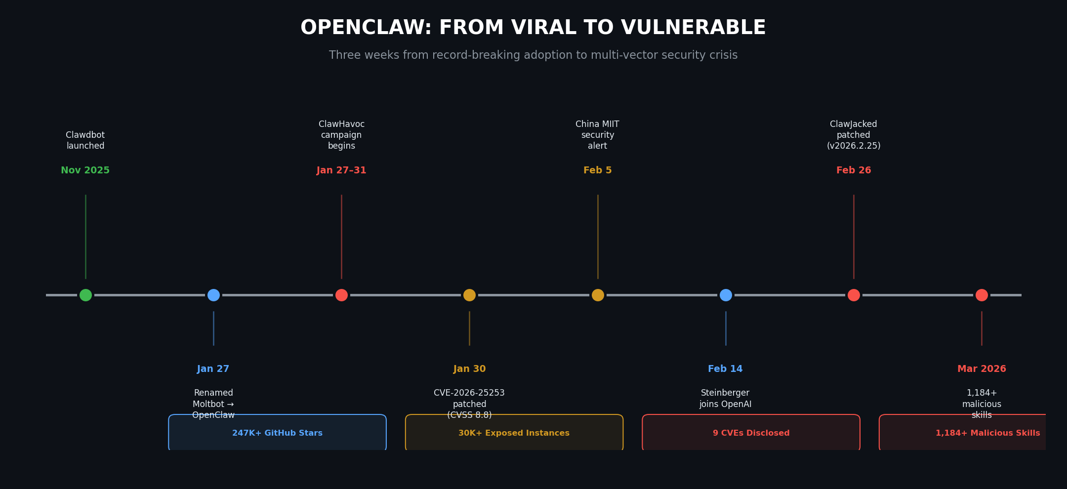 It took OpenClaw roughly three weeks to go from viral sensation to multi-vector enterprise threat. [¹] That timeline alone should make anyone building or deploying agentic AI systems sit up and pay very close attention.